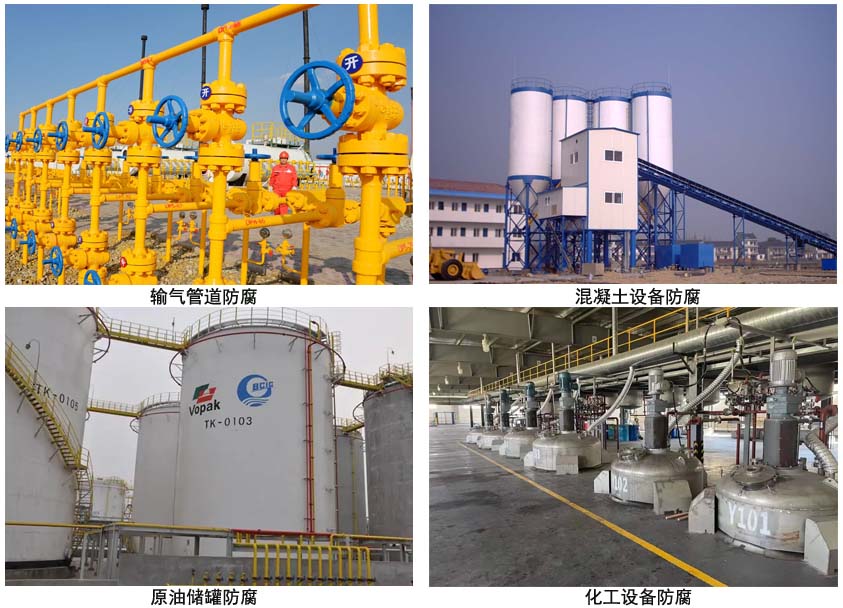 原油、污水、海水、工业水、汽油、煤油、柴油、喷气燃料、煤气等储罐、输油、输气管道及各类化工设备的腐蚀防护,还可用于混凝土设备的防腐蚀保护涂装。